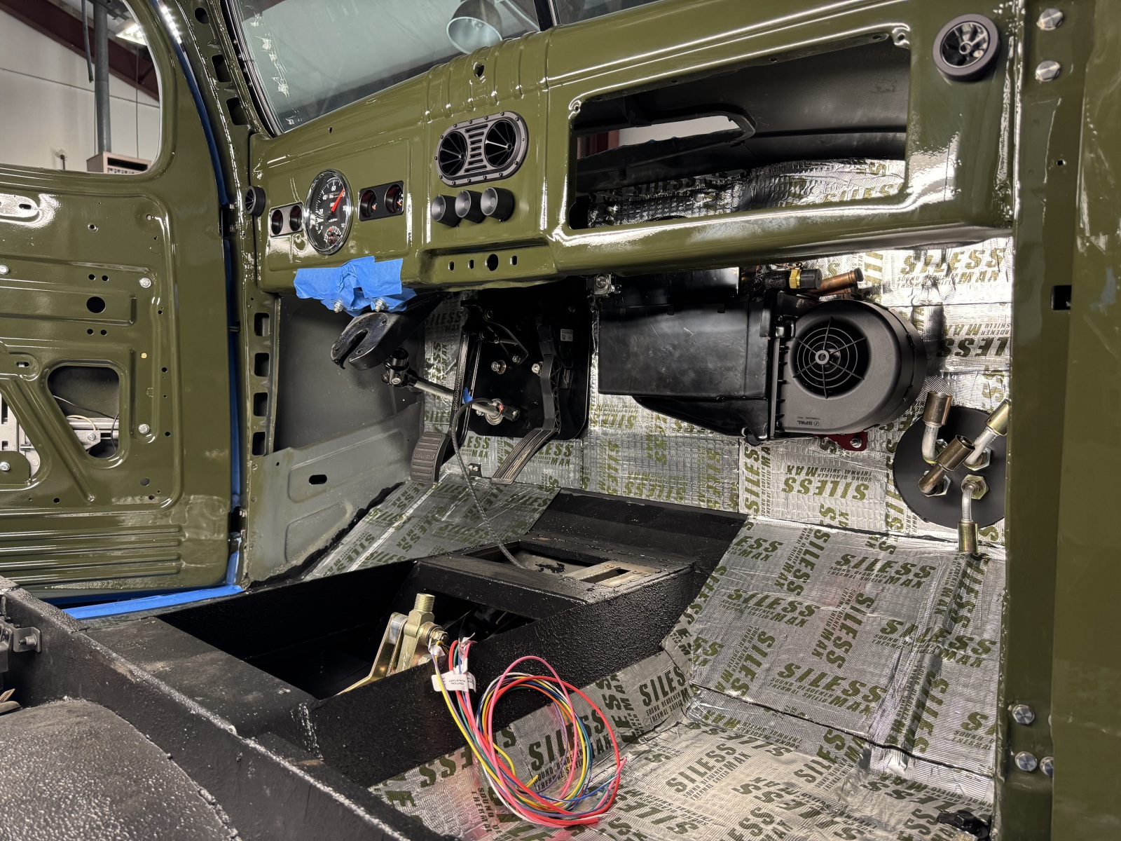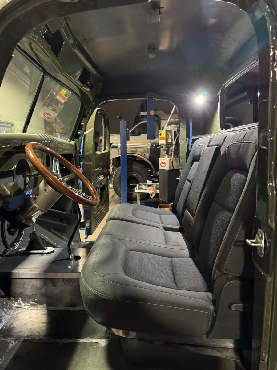Inside the cab a Wilwood pedal and Baer master cylinder provide stopping power. Steering comes via a Flaming River tilt column and Grant wood steering wheel. The back seat from a Chevy Colorado mounts to a custom base. Autometer gauges will provide the necessary information on the 5.7. A Restomod Air system was added to keep things comfortable.