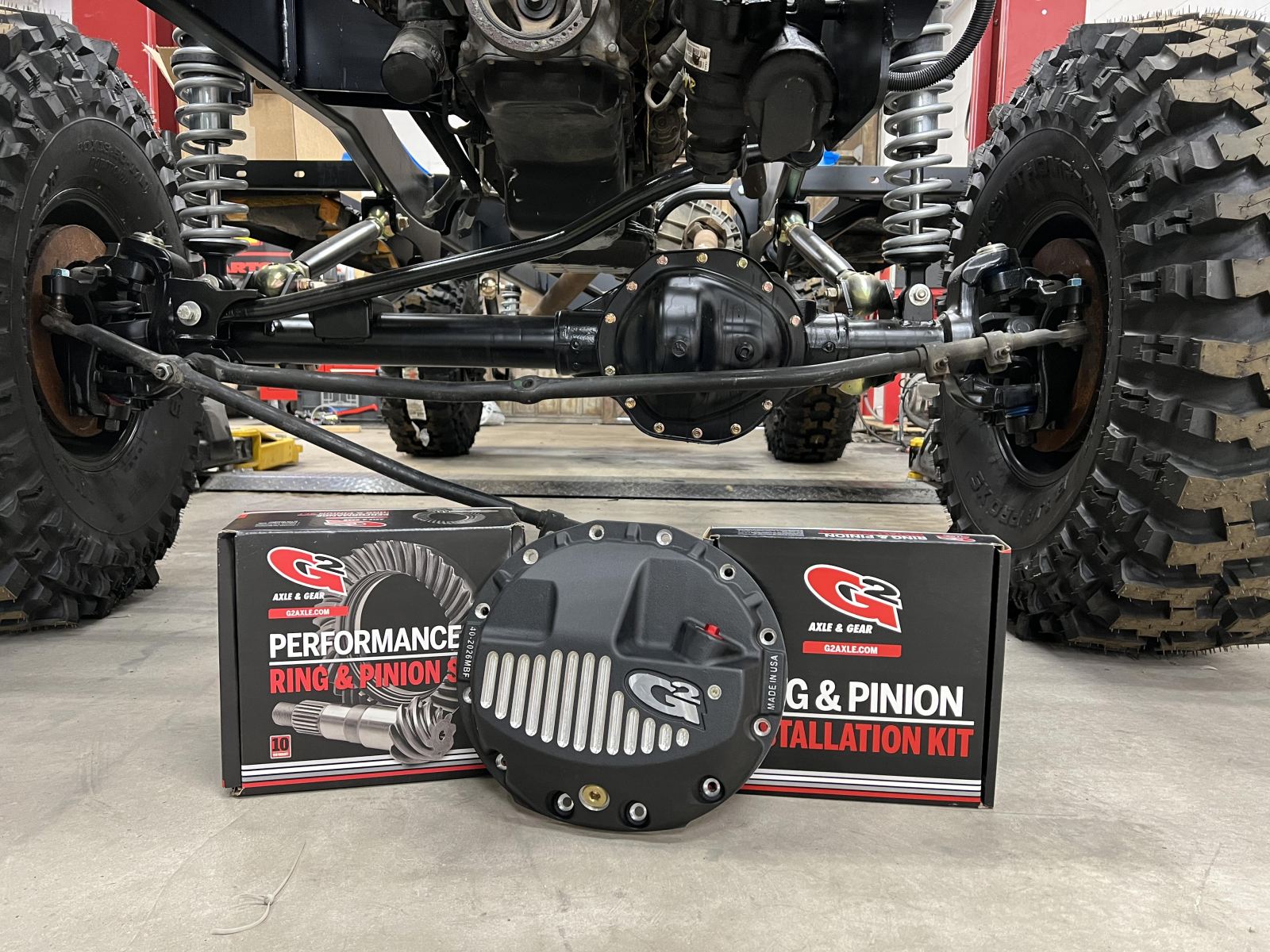 The axles got 4.56 gears from G2, an AAM e-locker front and limited slip rear, and G2 diff covers. The front axle got Yukon Free Spin hubs for better drivability. R1 Concepts Geomet slotted and drilled rotors and Heavy Duty pads will stop this truck easy via PowerStop coated calipers.